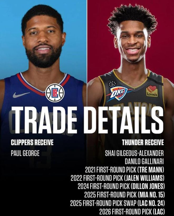 具体交易内容是:送出亚历山大、加里纳利、以及5个首轮签和2个首轮互换权,换来保罗乔治。当时快船管理层的逻辑看似合理:乔治是当打之年的全明星,能与伦纳德组成联盟最强的锋线组合;而亚历山大虽有潜力,但何时能成长为全明星级别仍是未知数。